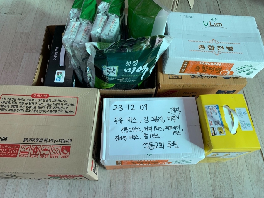 23.12.09. 석동교회에서 두유, 김, 미역, 전병, 커피, 짜파게티, 진라면, 귤을 후원해주셨습니다. 후원 감사드립니다 ^^