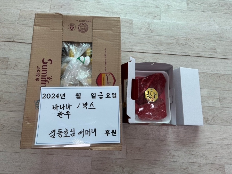 입주자 김** 님 보호자님께서 바나나 한박스와 한우 국거리를 후원해주셨습니다.