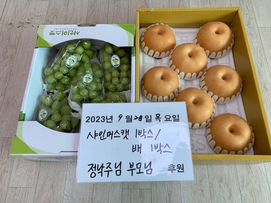입주자 정** 님의 보호자께서 샤인머스켓과 배를 후원해주셨습니다. 후원 감사합니다 ^^