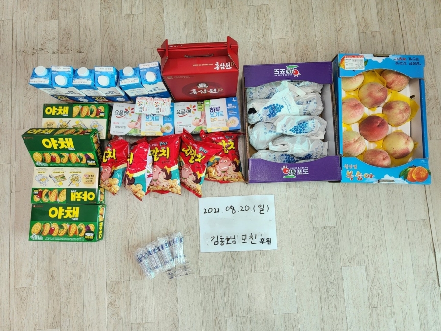 23.08.23 김** 입주자님의 보호자께서 포도, 복숭아, 요거트, 홍삼원, 우유, 여러 과자를 후원해 주셨습니다.