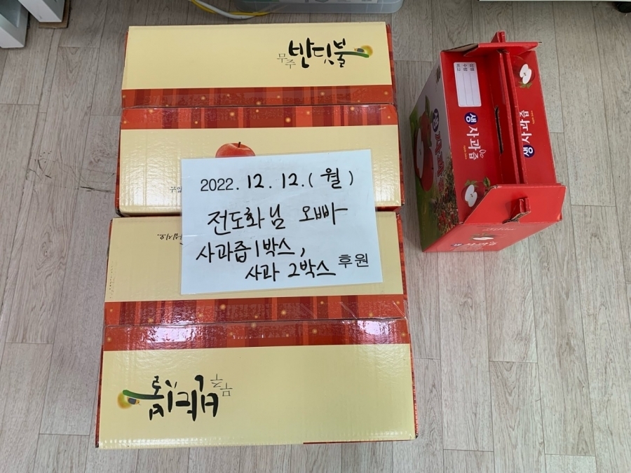 22.12.12 전*화 님 보호자님(오빠)께서 사과즙1박스, 사과 2박스, 빵 1상자 후원해 주셨습니다. 후원 감사드립니다.