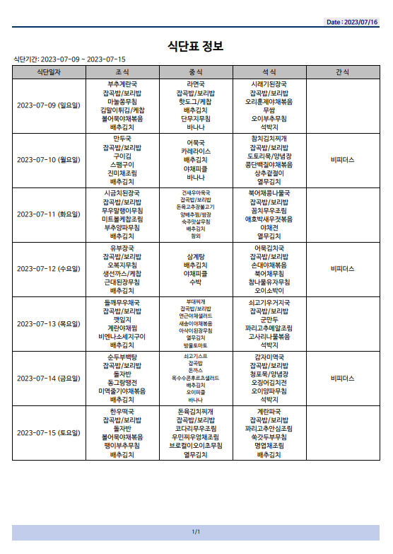 식단표(23.07.09~07.15)입니다