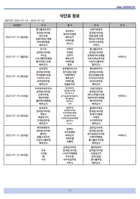 식단표(23.07.16~23.07.22)