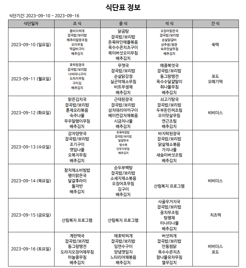식단표(23.09.10~23.09.16)