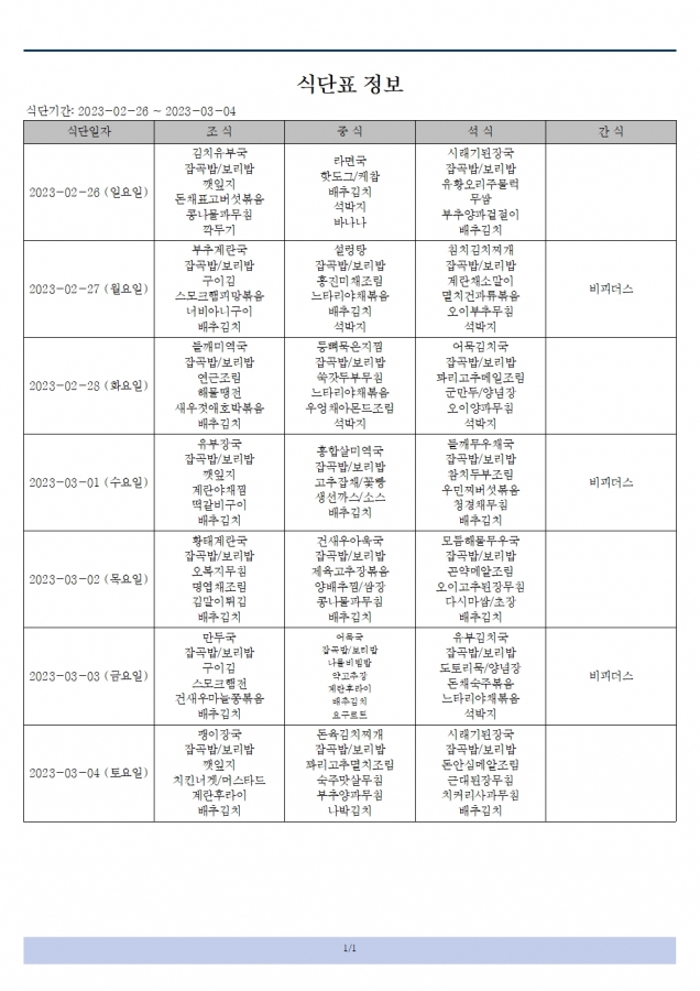 23.02.26~23.03.04 식단표 입니다.