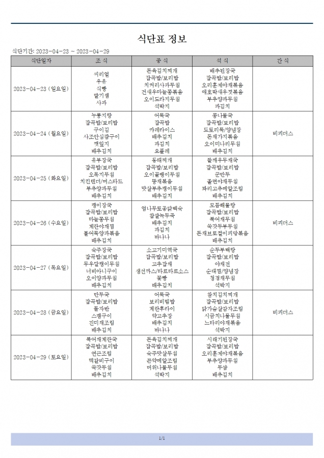 식단표(23.04.23~23.04.29)