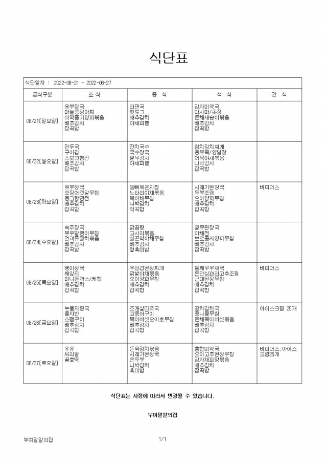 식단표 22.08.21 ~ 22.08.27