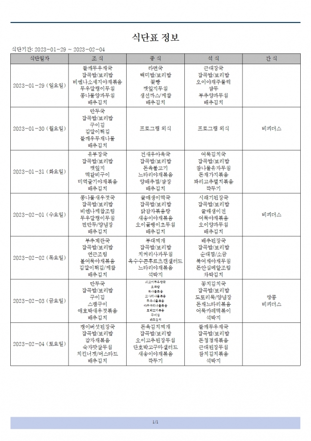 2023년 01월 29일 ~ 02월 04일 식단표 입니다.
