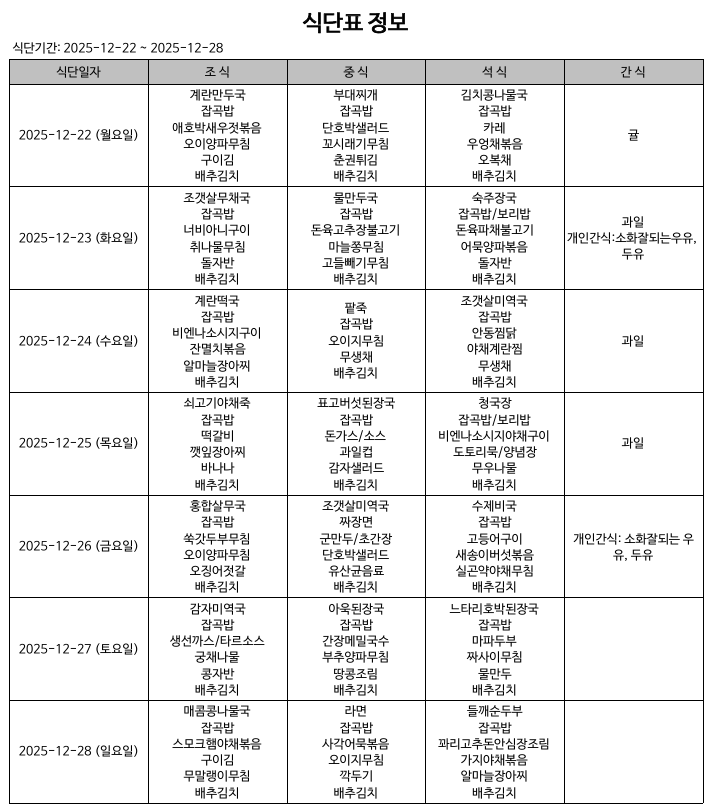 식단표(25.12.22.~25.12.28.)