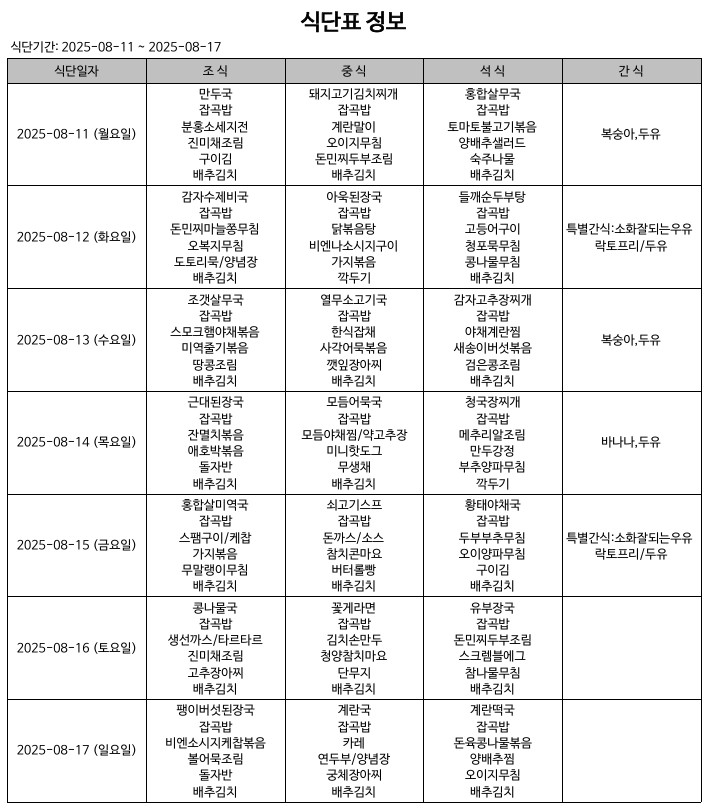 식단표(25.08.11.~25.08.17.) 입니다