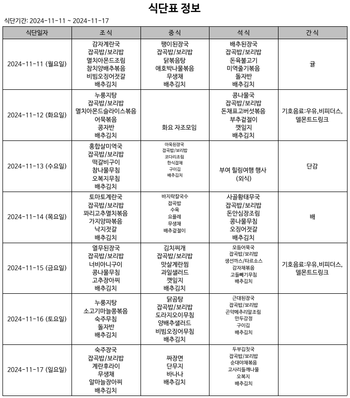 식단표(24.11.11~24.11.17)