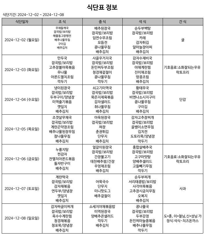 식단표(24.12.02.~24.12.08) 입니다