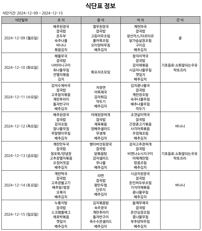 식단표(24.12.09.~24.12.15)