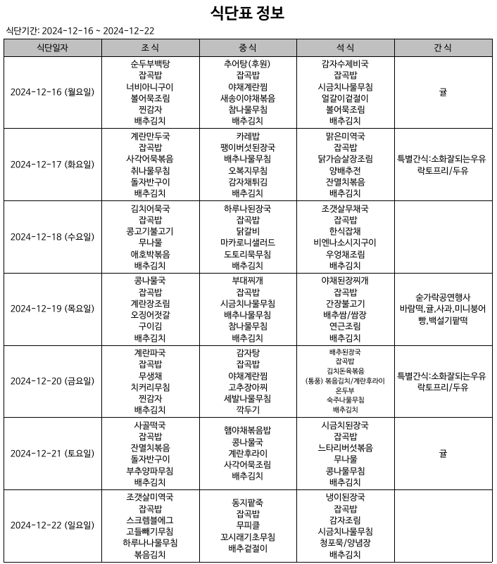 식단표(24.12.16.~24.12.22) 입니다