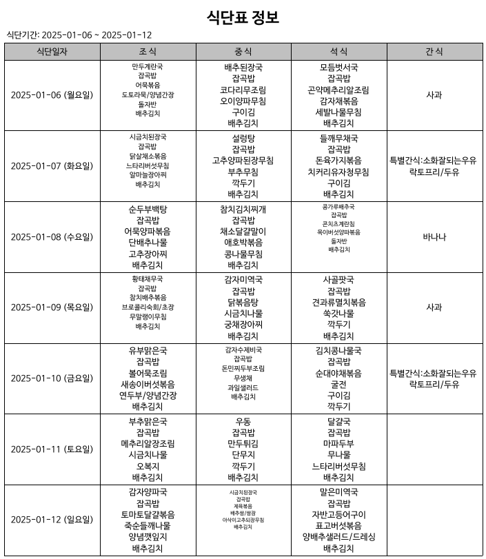 식단표(25.01.06.~25.01.12)