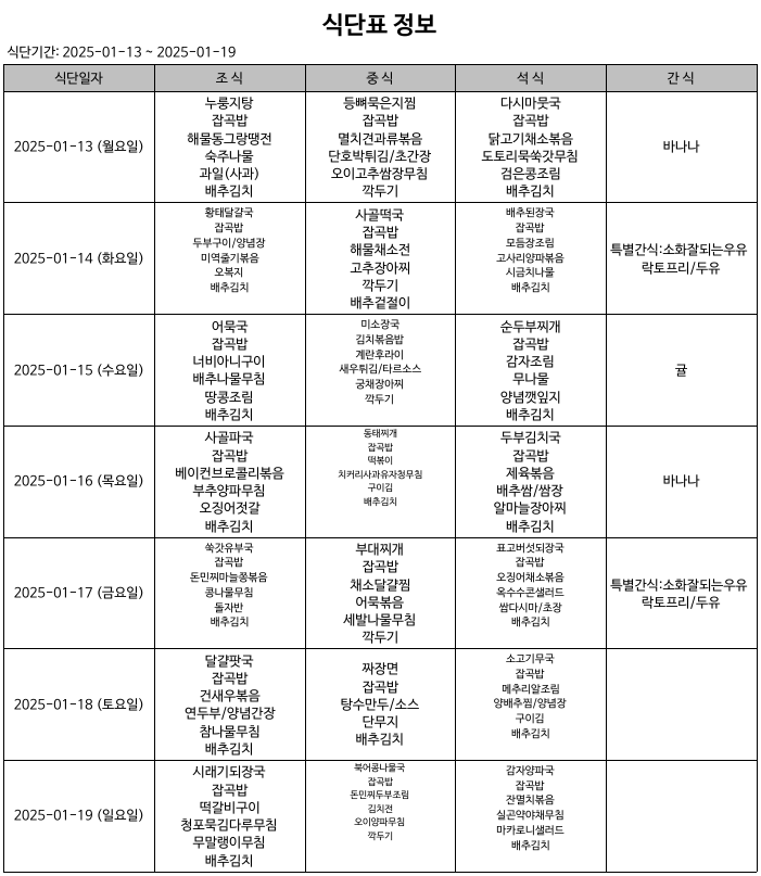 식단표(25.01.13.~25.01.19) 입니다.