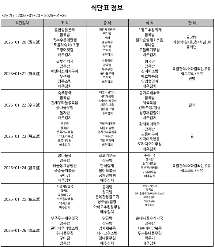 식단표(25.01.20.~25.01.26)