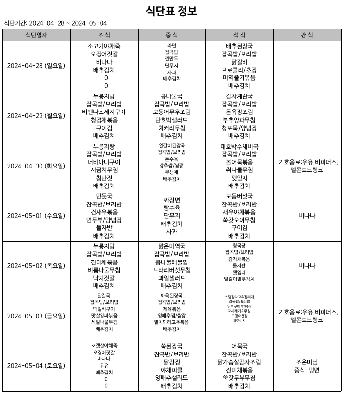 식단표(24.04.28~24.05.04) 입니다