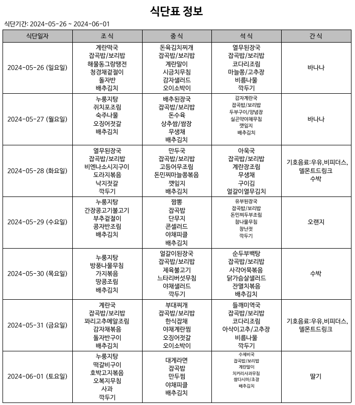 식단표(24.05.26~24.06.01) 입니다