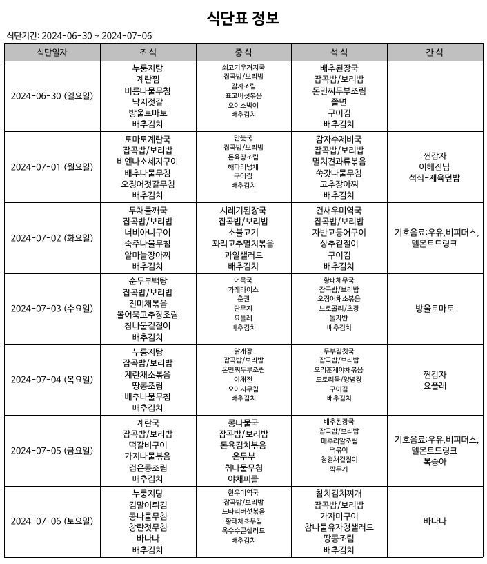 식단표(24.06.30~24.07.06) 입니다