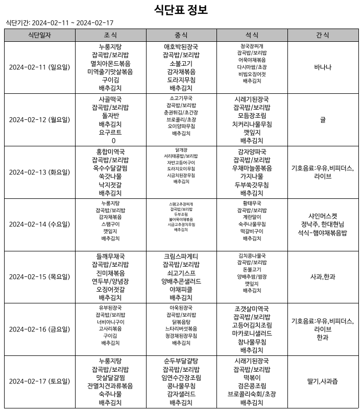 식단표(24.02.11~24.02.17) 입니다