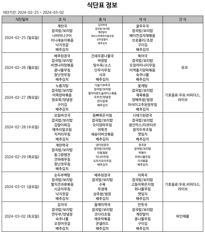 식단표(24.02.25~24.03.02) 입니다