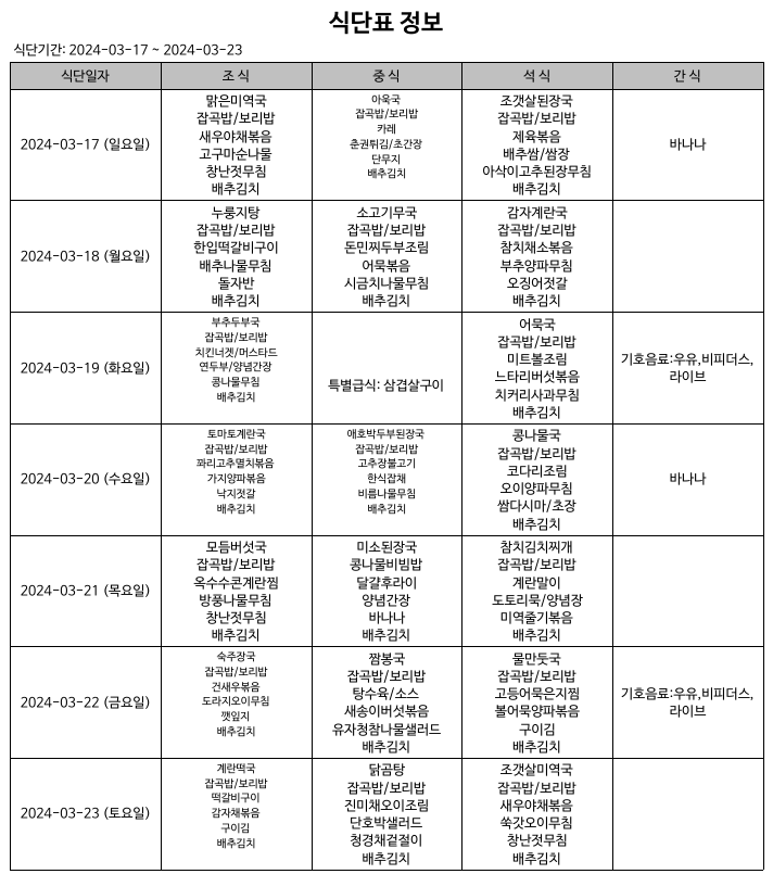 식단표(24.03.17~24.03.23) 입니다.