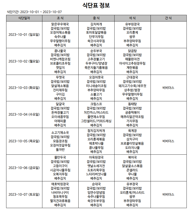 식단표(23.10.01~23.10.07)입니다.