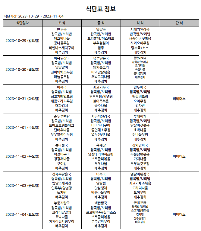 식단표(23.10.29~23.11.04)