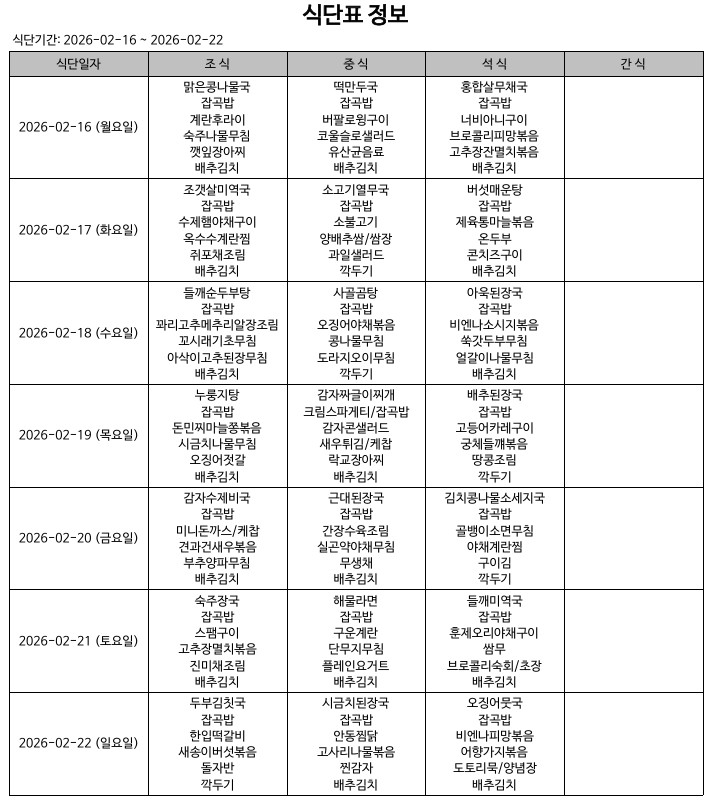 식단표(26.02.16.~26.02.22.)
