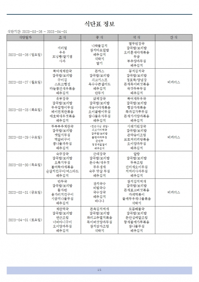 23.03.26~23.04.01 식단표 입니다.