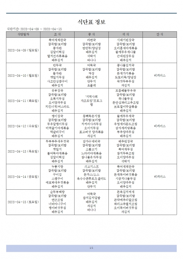 식단표(23.04.09~23.04.15) > 게시판