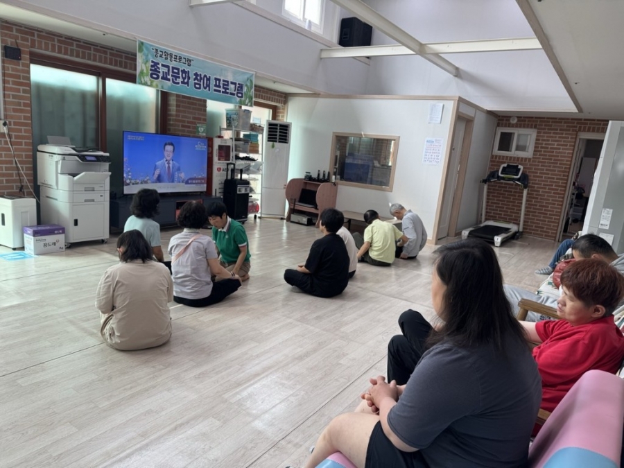 일요일 오후, 입주자분들과 함께 다목적실에 모여 TV로 종교 프로그램을 시청하였습니다.