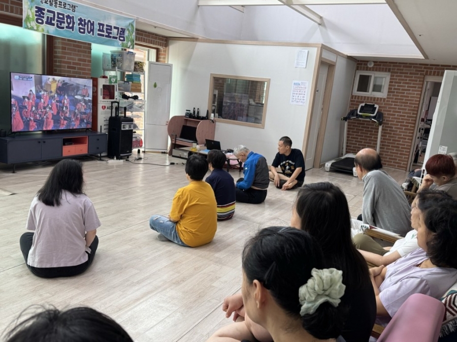 일요일 오후, 입주자분들과 함께 다목적실에 모여 TV로 종교 프로그램을 시청하였습니다.