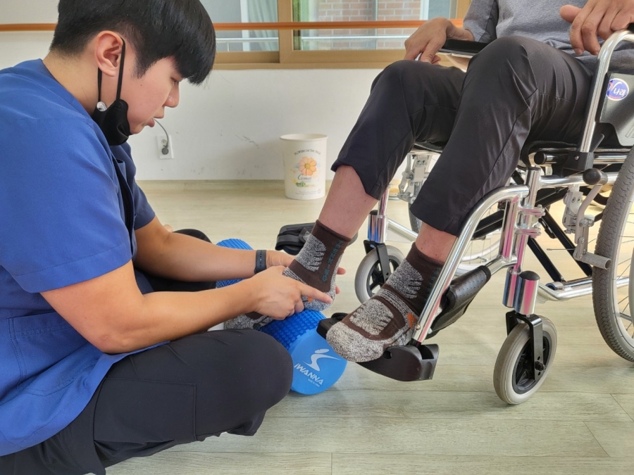 신** 님은 발목 스트레칭과 함께 보조기를 착용한 보행 연습을 열심히 하고 계십니다.