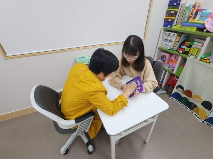 매주 대전에서 진행되는 언어치료에 참여하여 전** 님은 태블릿pc를 사용하여 단어를 배우고 계십니다.