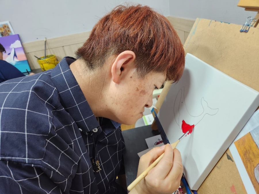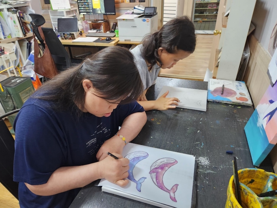 조**, 윤** 님은 먹지를 이용하여 고래그림을 따라 그리며 스케치를 하는 연습을 하셨습니다.