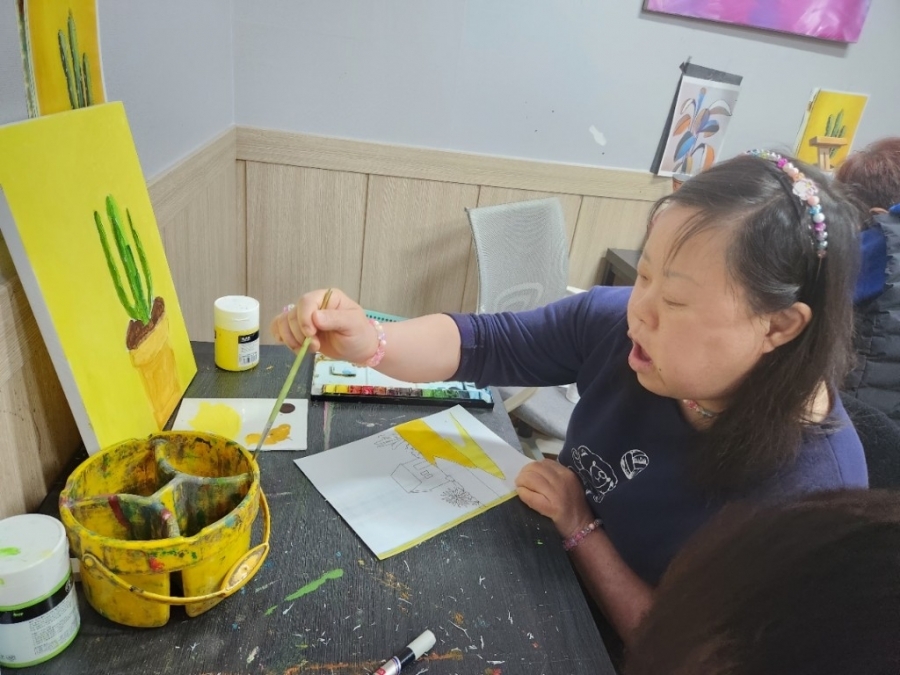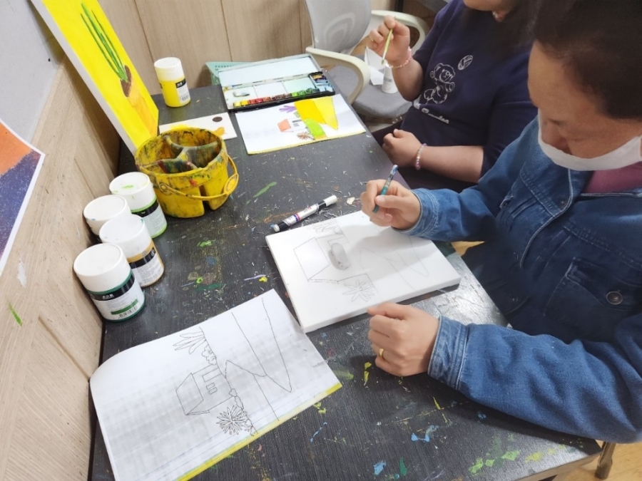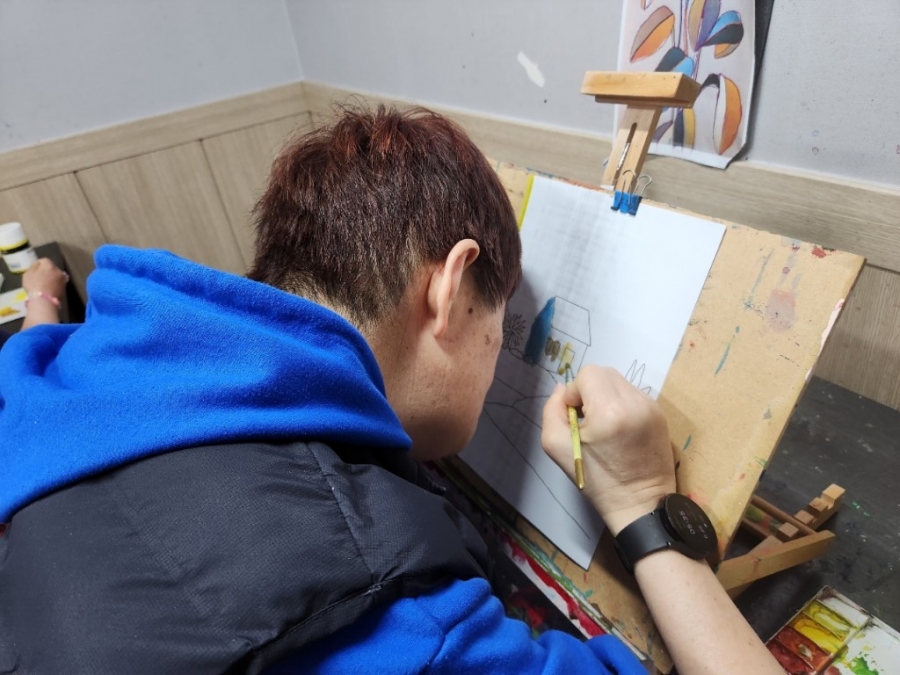 매주 수요일과 목요일에 입주자 정**, 천**, 윤** 님이 미술학원에서 진행되는 미술활동에 개별서비스로 참여하고 계십니다. 이번 시간에는 언덕위 집을 그려보는 시간을 가졌습니다. ^^