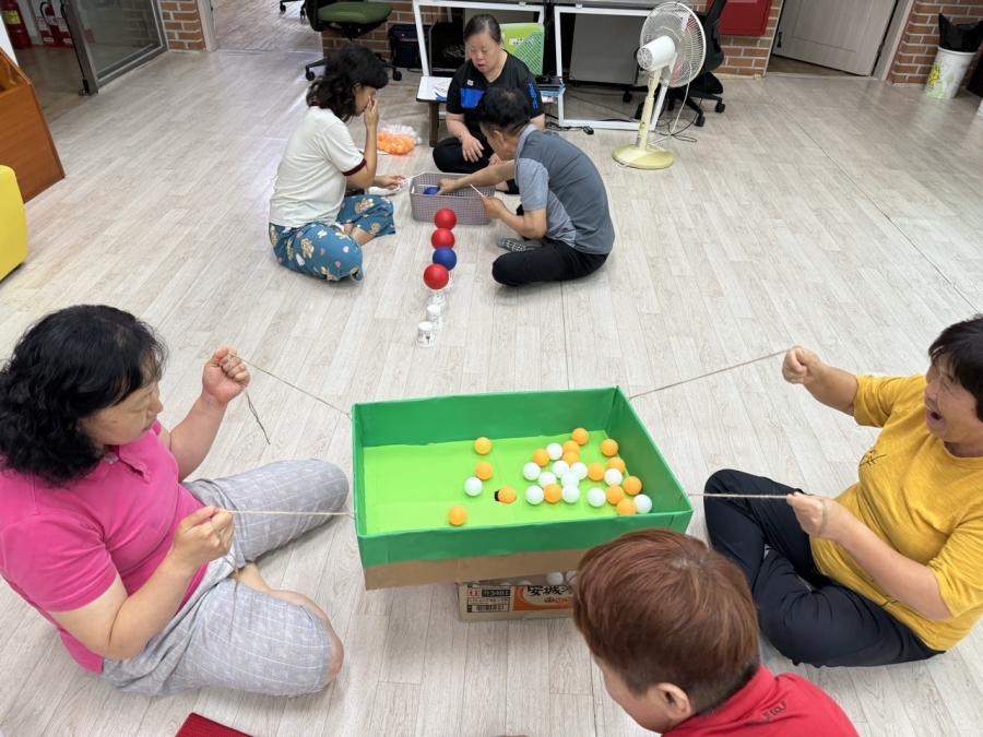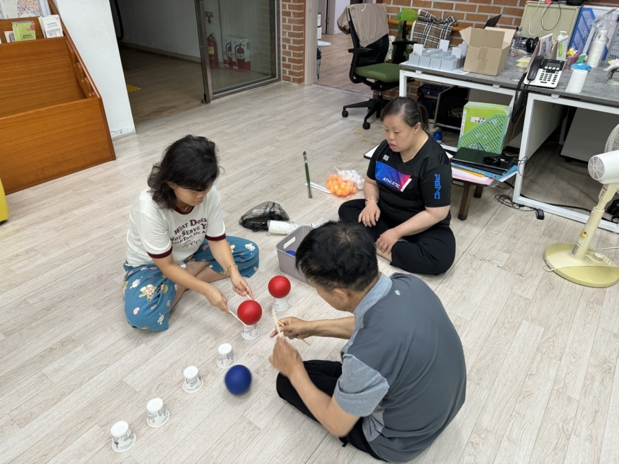 교구를 통해 진행하는 미니게임를 진행하였습니다. 함께 하는 공옮기기, 탁구공 많이 넣기 게임을 진행하였습니다.