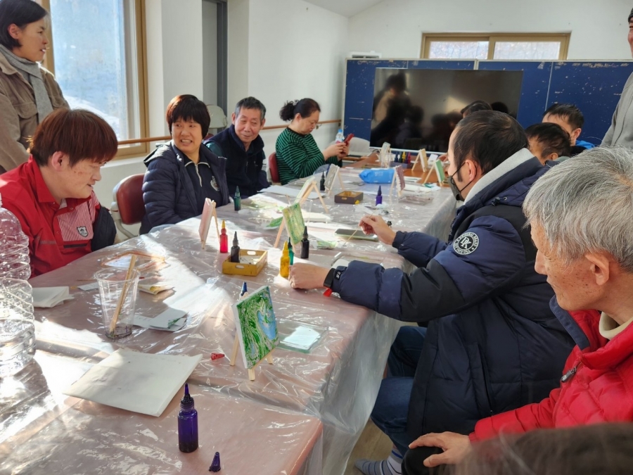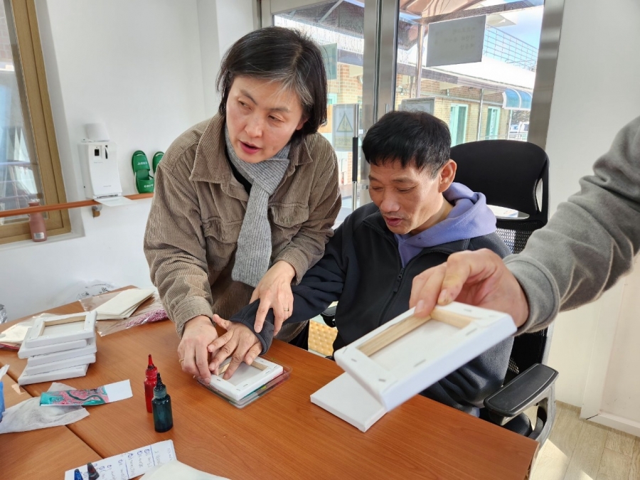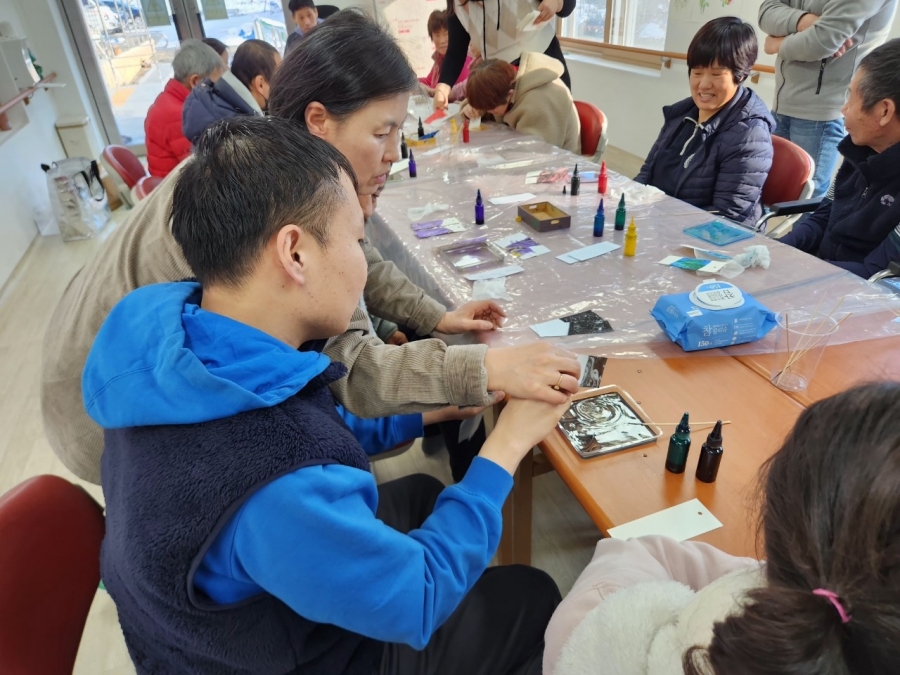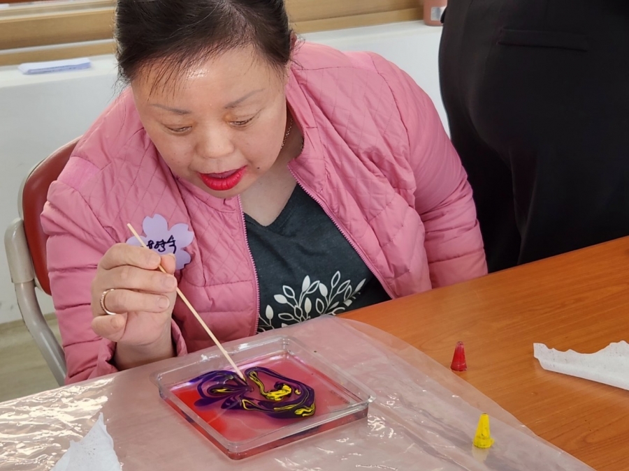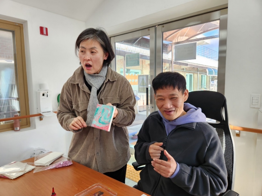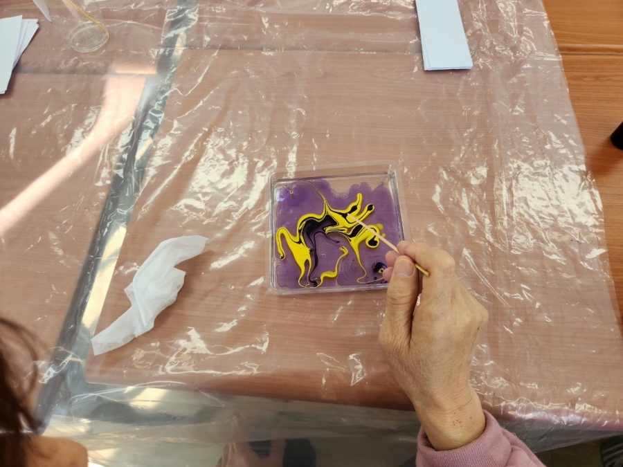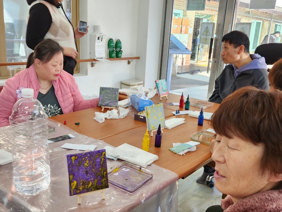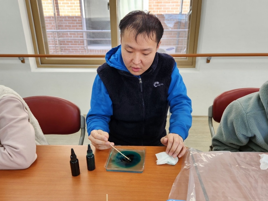 우리 입주자님들이 직접 물감을 선택하여 입으로 불거나 스틱으로 건드려 직접 그림을 그리는데요~