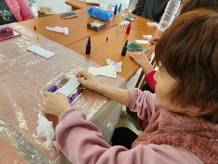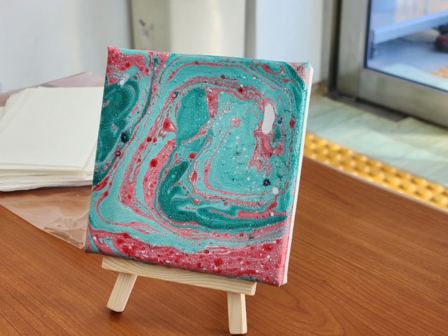 기름으로 만들어진 염색물감으로 물 위에 그림을 그려 캔버스에 그대로 떠올리는 미술형태를 마블링이라고 합니다.