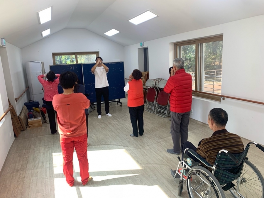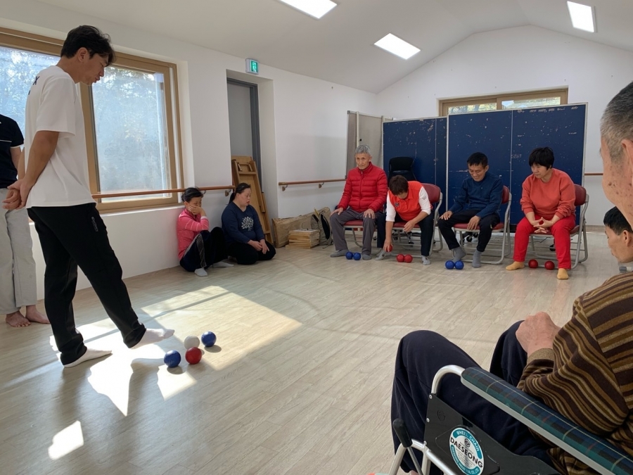 체력단련실에 모여 체육프로그램 보치아 경기에 참여하셨습니다.