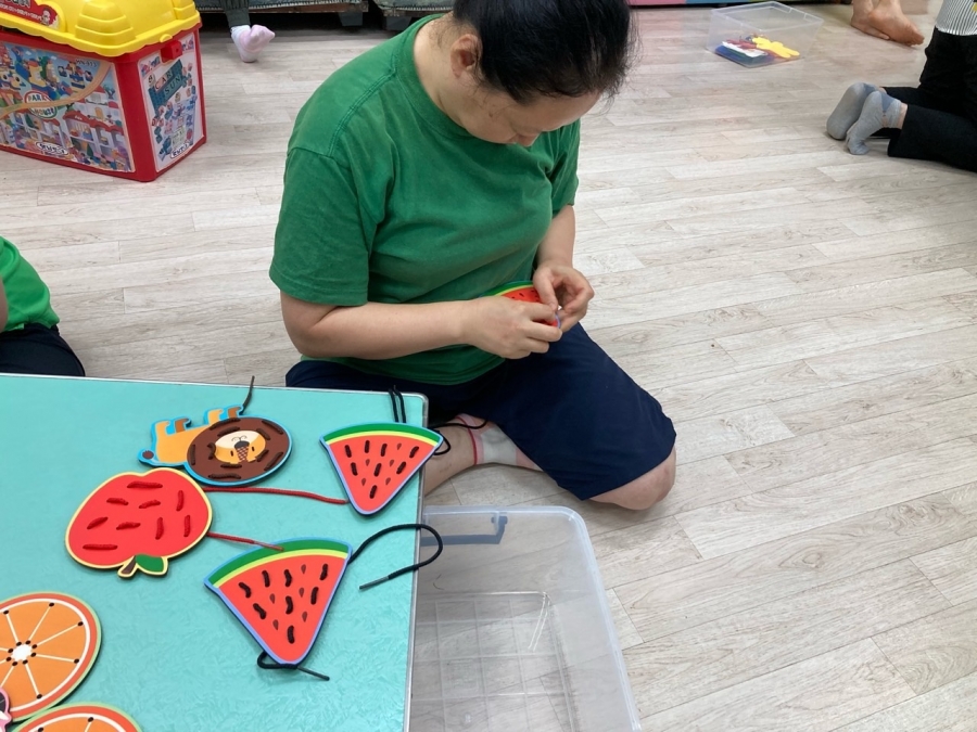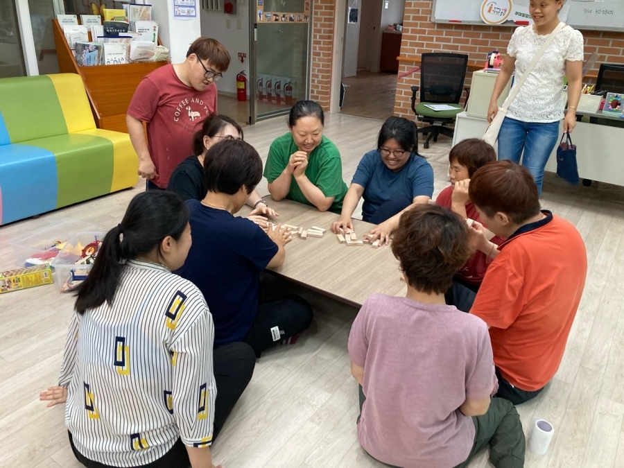 23.07.07 비오는 날, 축 쳐지는 날씨 속에 기운이 없으신 입주자님들과 함께 젠가와 실뜨기 놀이를 실시하였습니다.