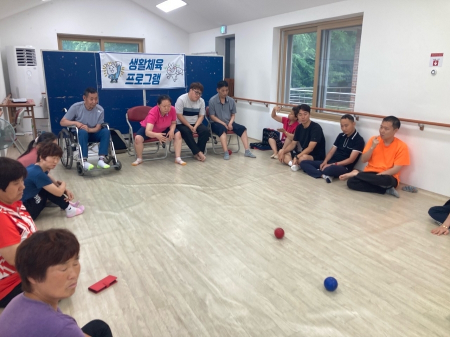 23.06.26 장애인체육회 강사님께서 원내 방문하여 생화체육 보치아를 실시했습니다.