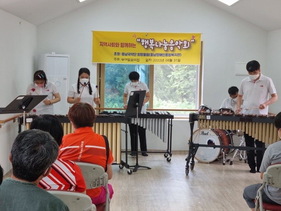 22.08.31 충청남도남부장애인종합복지관의 희망울림 "행복나눔 음악회"에 선정되어 프로그램을 실시할 수 있었습니다. 코로나19로 인해 계획과는 달리 지역주민과 함께 음악회를 즐길 수 없어 함께하지 못하는 아쉬움이 있었지만 정성스럽게 만든 도시락 전달로 아쉬움을 대체하였습니다.