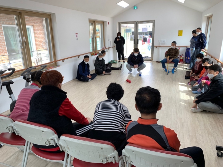 22.03.21 장애인체육회 강사님께서 원내 방문하셔서 체력단련실에서 생활체육을 진행했습니다.